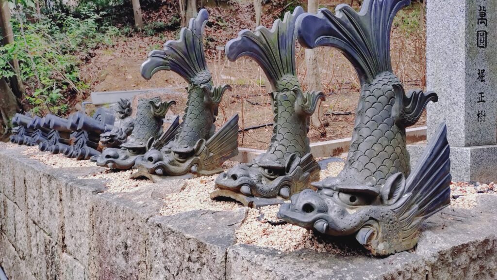屋根は近年よく見る本瓦ではなくガルバリウム鋼板(?)に変わっており、降ろされた瓦などは本殿の横に陳列されています。
