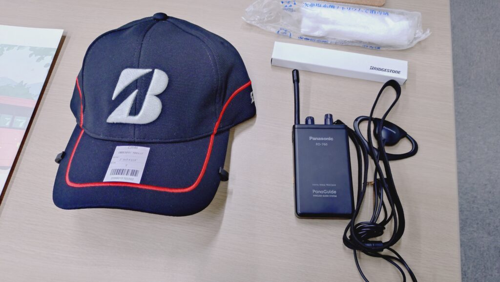 工場内で削ったゴムのカスなどを防ぐバイザーを後付けしたブリヂストンオリジナルの帽子、大きな音が常に響いている工場内で解説の声を聞く為のトランシーバーを着用してからいざ見学へ。
