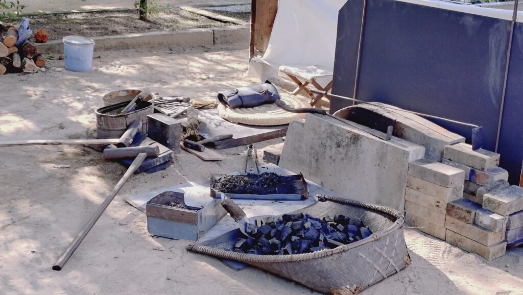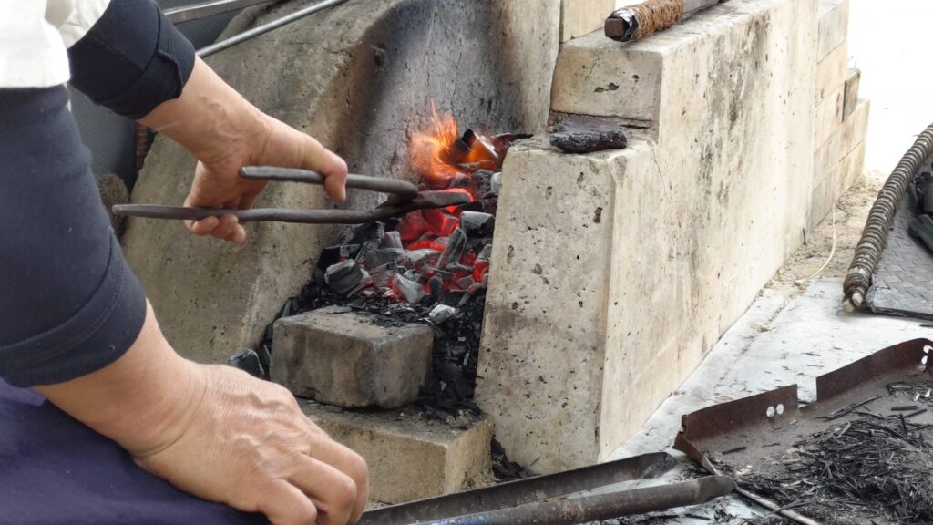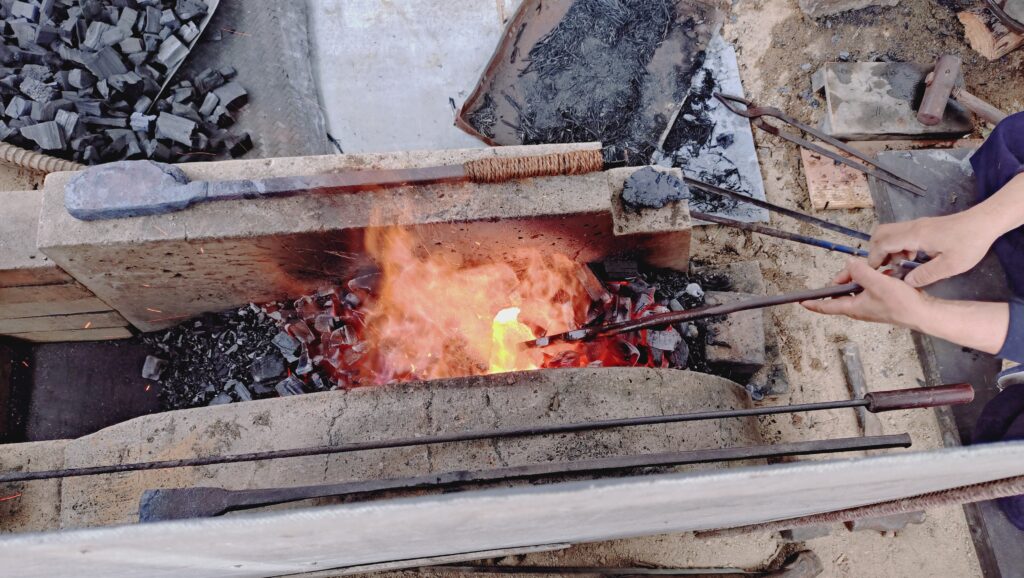 鉄を炉に入れている間は手押し式の鞴で風を送って火を起こし、鉄は燃える炭の中や画像の様に火の中で熱して高温にしてから叩く。