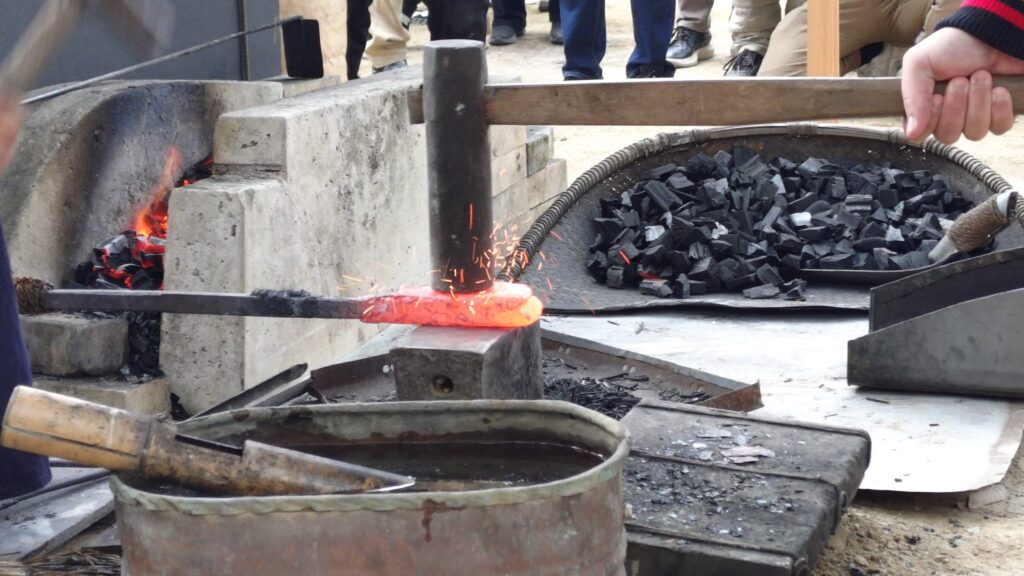 体験に先立ち、刀匠3名による鍛錬の実践。