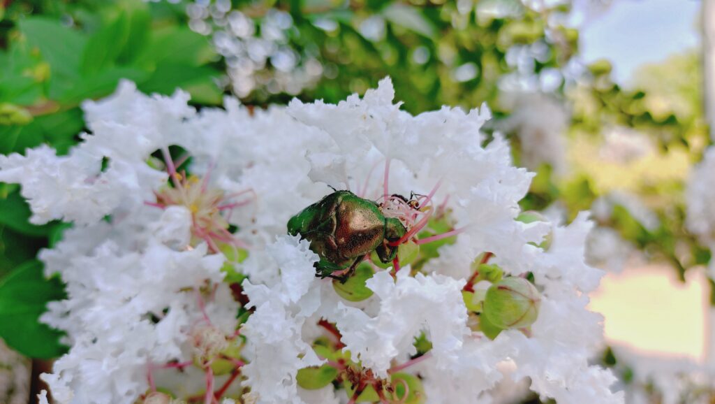 まだ暑い中で花はしっかりと咲き、カナブンが蜜を吸いに来ている季節。